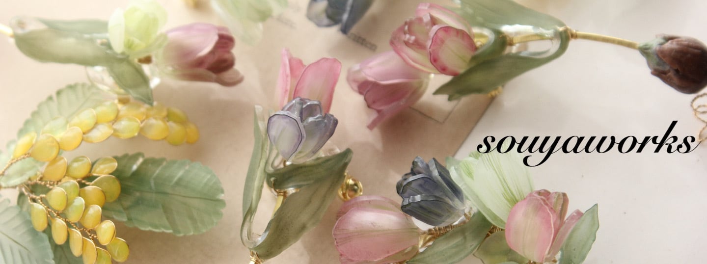 この度は souyaworks web shop をご覧いただきありがとうございます。 郵便料金値上げに伴いまして、送料改定と基本発送を見直しさせていただきました。 5000円以上お買い上げの送料は無料とさせていただきます。5000円〜はレターパックライト、10000円〜は宅急便コンパクトでの発送となります。 よろしくお願いします。 お買い物前にこちらをご一読ください。 作品はひとつひとつ着色し手作りしているため、色むらがあります。また、同一商品にも個体差がありますことをご了承くださいませ。 プラ板の着色は自然素材と馴染ませるため、クリアな発色ではなく、少し濁りがございます。それが当店の商品の魅力とご理解ください。 プラ板はひとつひとつ表面にヤスリをかけておりますため、すりガラスのような艶消し感があり、半透明にできているため、合わせるお洋服の色によって、色味が変わります。 イヤーアクセサリーは髪のアップスタイルとダウンスタイルで、光の透過の具合で色味が変わります。 同じ商品の数量を複数個と表示してある場合、写真とは異なる個体のお届けとなることもございますが、作成方法や大きさなど、なるべく統一しております。 個体指定はできませんので、ご理解のうえご購入をお願いいたします。 また、サイズ表記には、多少の誤差があります。 写真と実物の色味になるべく近づけて撮影する努力はしておりますが、実際とは少し違って見えることがございます。ご質問、不明な点は、必ずご購入前にご連絡ください。 レジンを使用している作品にはわずかに気泡があり、経年変化により艶感が無くなったり、多少の黄変の可能性があります。 真鍮線は経年変化で黒ずみが出ますが、磨ける箇所は金属磨きで磨いてください。 ワイヤー線やプラ板は、細かい加工を施しているため、繊細で金属のしなりやプラ板のエッジがございます。衣服への引っ掛けや摩擦、圧迫などのダメージには十分お気をつけください。 金属アレルギーやレジンアレルギーがある場合、肌に接する部分に真鍮やレジンを使っております。イヤーアクセサリーのご購入はお控えくださいますようお願いいたします。 お買い物の際は、システム上、会計一回につき送料が加算されますので、複数回のお買い物の場合、送料をとりまとめることができません。 海外発送はできませんので、国内のみのご購入となります。 ご了承ください。 返品・交換は基本的にご遠慮頂いております。 あくまでハンドメイド品ということをご理解いただいた上でのご購入をお願い致します。 商品の営利目的での購入・転売はご遠慮いただきます。 転売目的であると判断した場合、ご購入後であってもキャンセルさせていただくことがございます。 ご購入後5日以内に発送します。 それでは、みなさまのお気に入りに出会えますように!